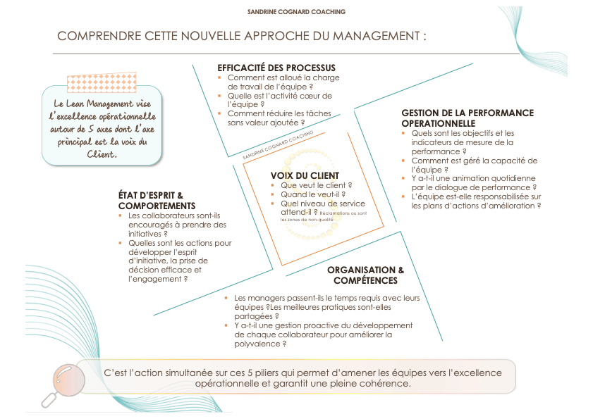 Le Client est-il satisfait de la fluidité du processus ? Avez-vous un système de pilotage de l’activité pour déceler toute insatisfaction ou toute alerte ? Est-ce que l’état d’esprit et le comportement des collaborateurs et du manager sont orientés satisfaction client ? Est-ce que les compétences des collaborateurs sont utilisés à leur plein potentiel ?