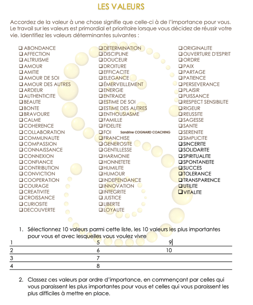 En coaching, c’est un exercice que je fais faire rapidement à mes clientes parce que connaitre ses valeurs et les connaitre par coeur c’est le gage d’identifier rapidement lorsqu’elles sont bafouées ou transgressées.