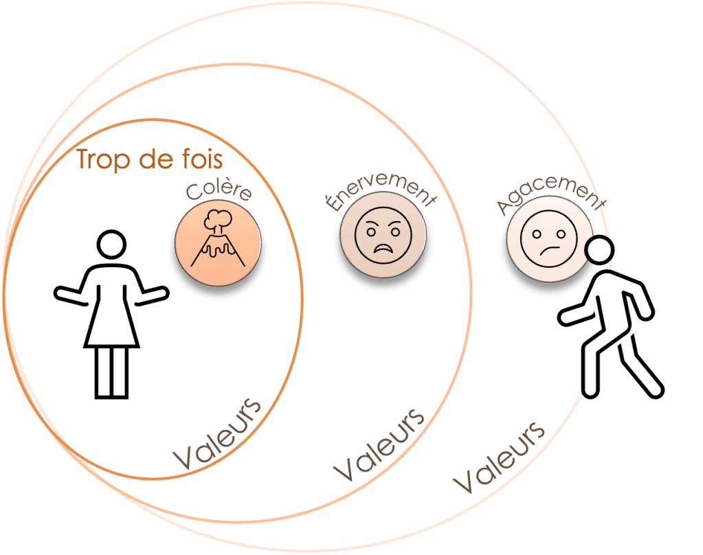 Le premier signe de reconnaissance d’une transgression est associée en général, au ressenti corporel et particulièrement à l’agacement, premier signe avant-coureur que le système de valeurs est bousculée. Si je ne dis rien et que je me tais, l’agacement s’amplifie et laisse place à l’énervement. Lorsque je ne dis rien, l’énervement laisse place à la colère…