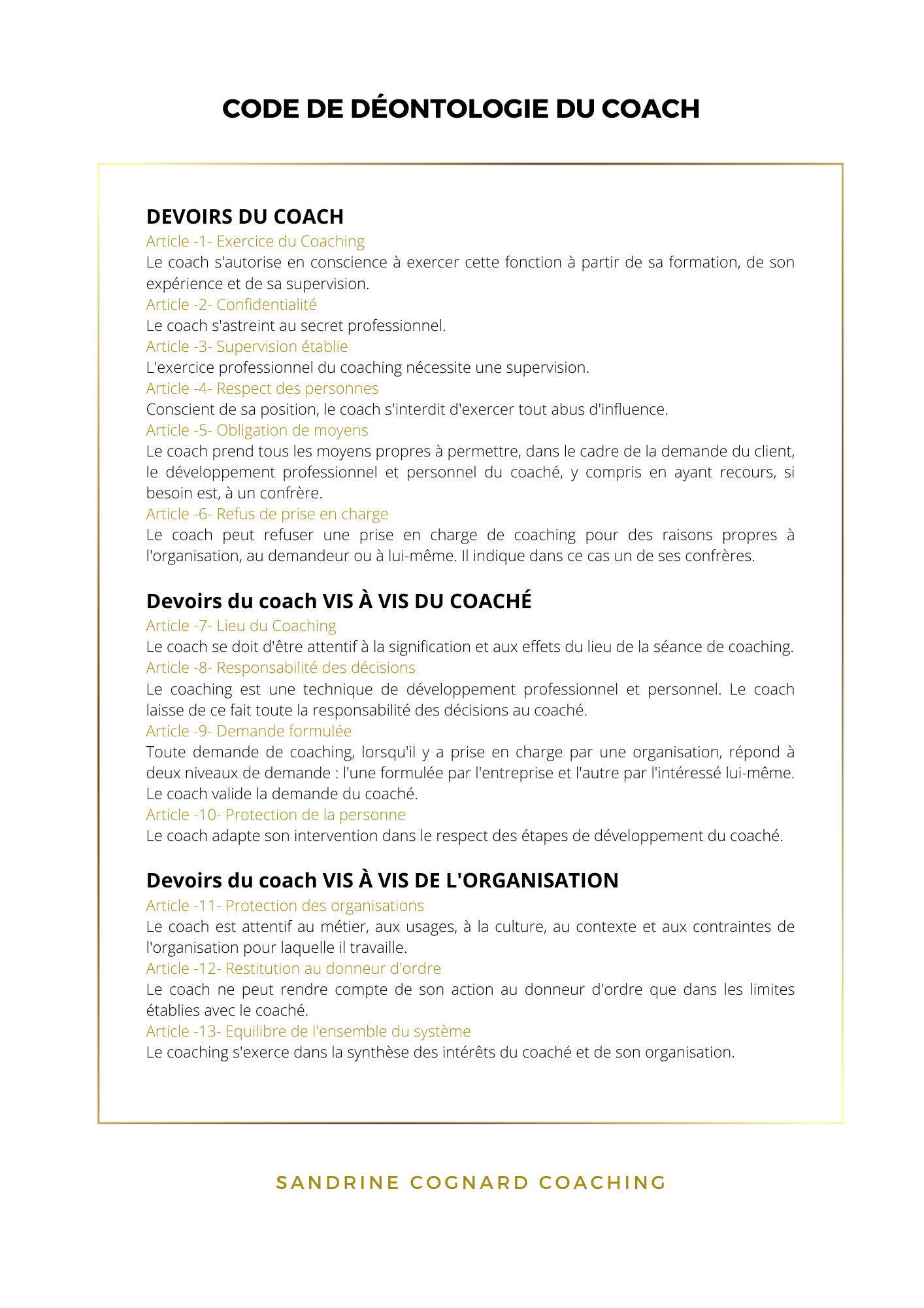 Le coaching allie la rigueur d’un cadre formel d’un contrat de coaching et la flexibilité dans la posture. Le coach se doit d’être fiable, en accord avec ses propres valeurs et en respect total avec ses engagements. Il se doit d’être authentique et transparent, il est là pour faire prendre conscience de la réalité. Le coach exprime clairement tout élément agréable ou désagréable avec bienveillance permettant au coaché d’avoir un autre point de vue. Le non jugement existe surement dans l’absolu, le coach focalisera plus sur les qualités de la personne. Les axes d’amélioration seront pris en compte pour venir démanteler les blocages et les transcender en actions simples (politique des petits pas).